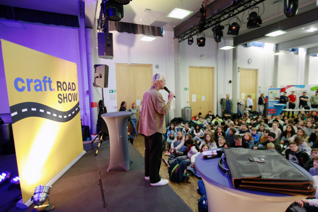 Schülerinnen und Schüler der siebten, achten und neunten Klassenstufe lernen das Handwerk innerhalb eines Vormittags in einem ungezwungenen Rahmen näher kennen und sind zum Mitmachen eingeladen. Den Kern der craft.ROADSHOW bildet der Praxisteil. Junge Handwerkerinnen und Handwerker sowie Auszubildende aus den Innungsbetrieben der Kreishandwerkerschaft Region Karlsruhe stehen den Schülerinnen und Schülern im Rahmen von verschiedenen Mitmach-Aktionen Rede und Antwort. Die Schülerinnen und Schüler nutzen die Möglichkeit verschiedene Handwerksberufe niederschwellig praktisch auszuprobieren.